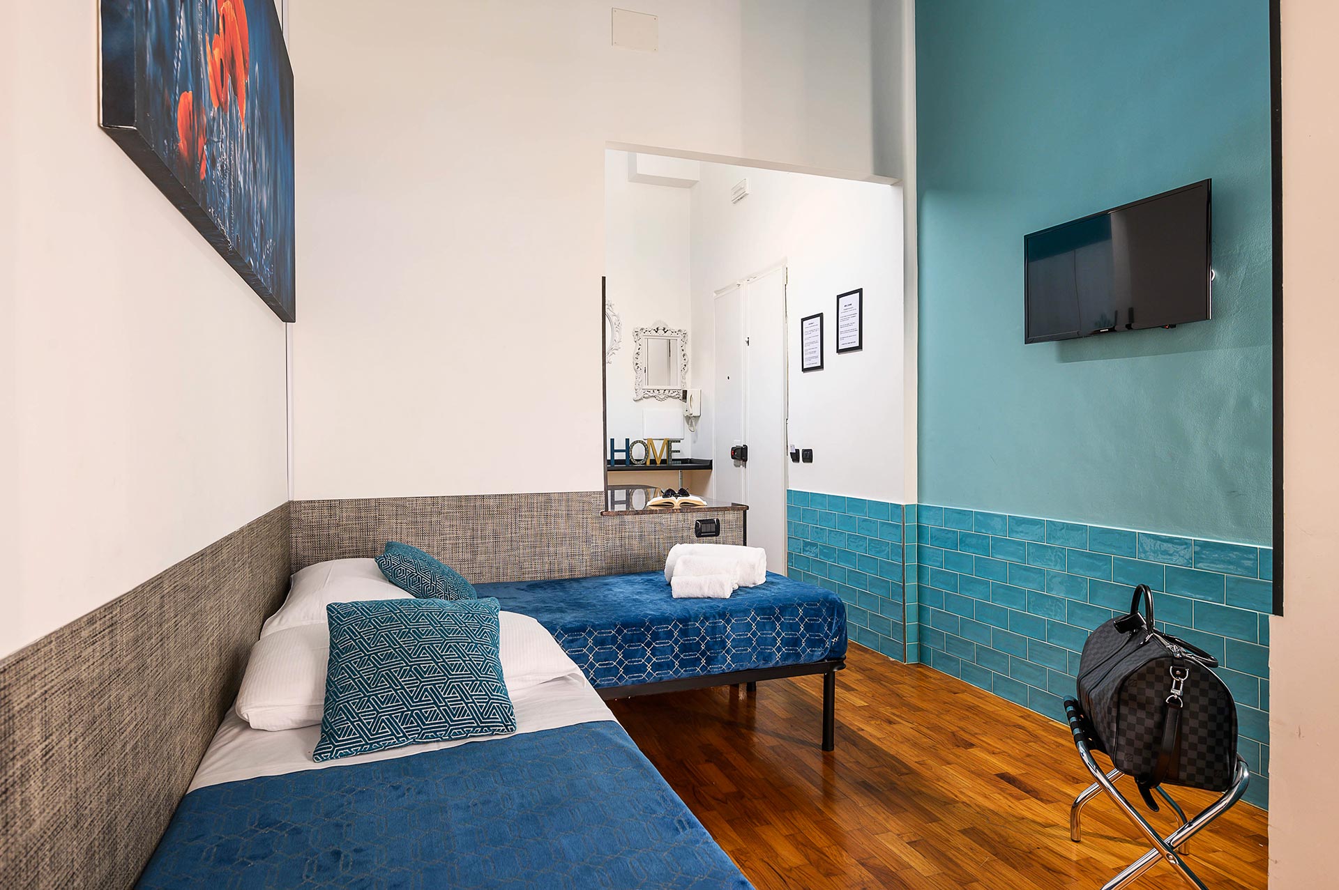 2 camere comunicanti (una tripla e una doppia con 2 letti singoli) di circa 28m quadri totali con bagno privato. La camera è più grande rispetto alla media in zona, ed è dotata di tutti i comfort.